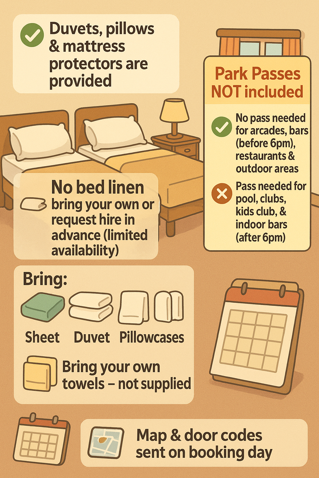 Park Passes:  Please note, park entertainment passes are required for the facilities on site. These will need to be purchased directly with the site reception on arrival if you will use the facilities. If you don’t plan on using the on site facilities or bars, you will not require the passes. If you check in after reception has closed, please speak to security who will be able to help with the purchase of them.